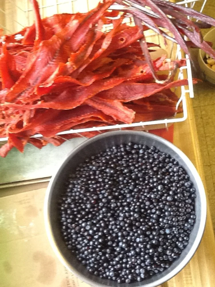A lot of it has to do with harvesting, going out and picking blueberries, drying and smoking fish in the summer. Learning how, where and when to harvest the natural foods that grow around us. The blueberries, the cranberries, the fiddlehead ferns in the spring. All of the different things that you can collect. The rose hips and my goodness the hooligan oil/greece.